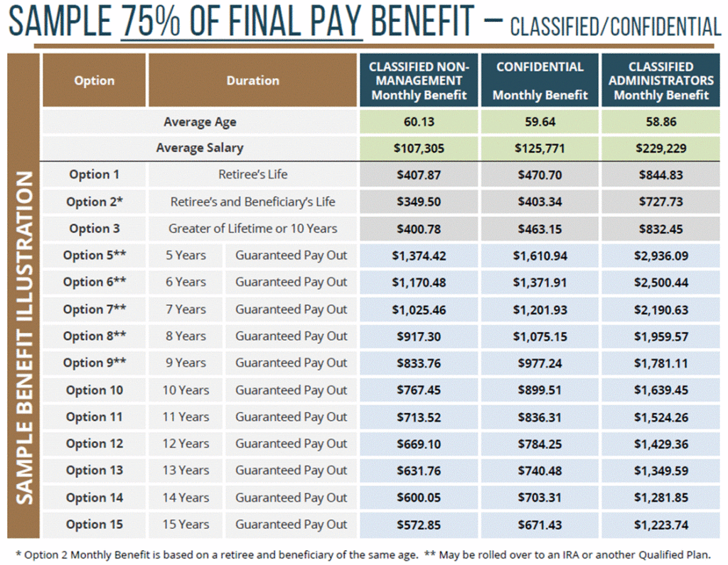 We’re still awaiting complete information, but a chart was provided below to estimate what the 15 different options may look like for the average eligible employee (age 60, income 107k$/yr):